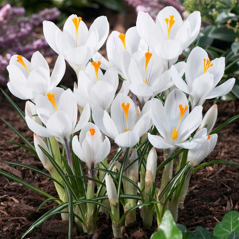 Collection of the following bulbs to create a mass of white blooms: Crocus Jean d’Arc, Allium neapolitanum, Hyacinth Carnegie, Allium Mt Everest