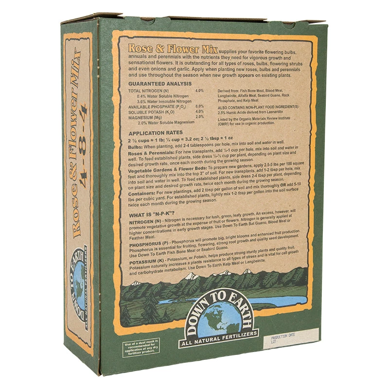 Rose and Flower Mix supplies your favorite bulbs, annuals and perennials with the nutrients they need for vigorous growth and sensational flowering. It is outstanding for roses, blooming bulbs, onions and garlic. Apply in the spring or fall when planting bulbs or as a side dress when new growth appears on existing perennials and roses.
